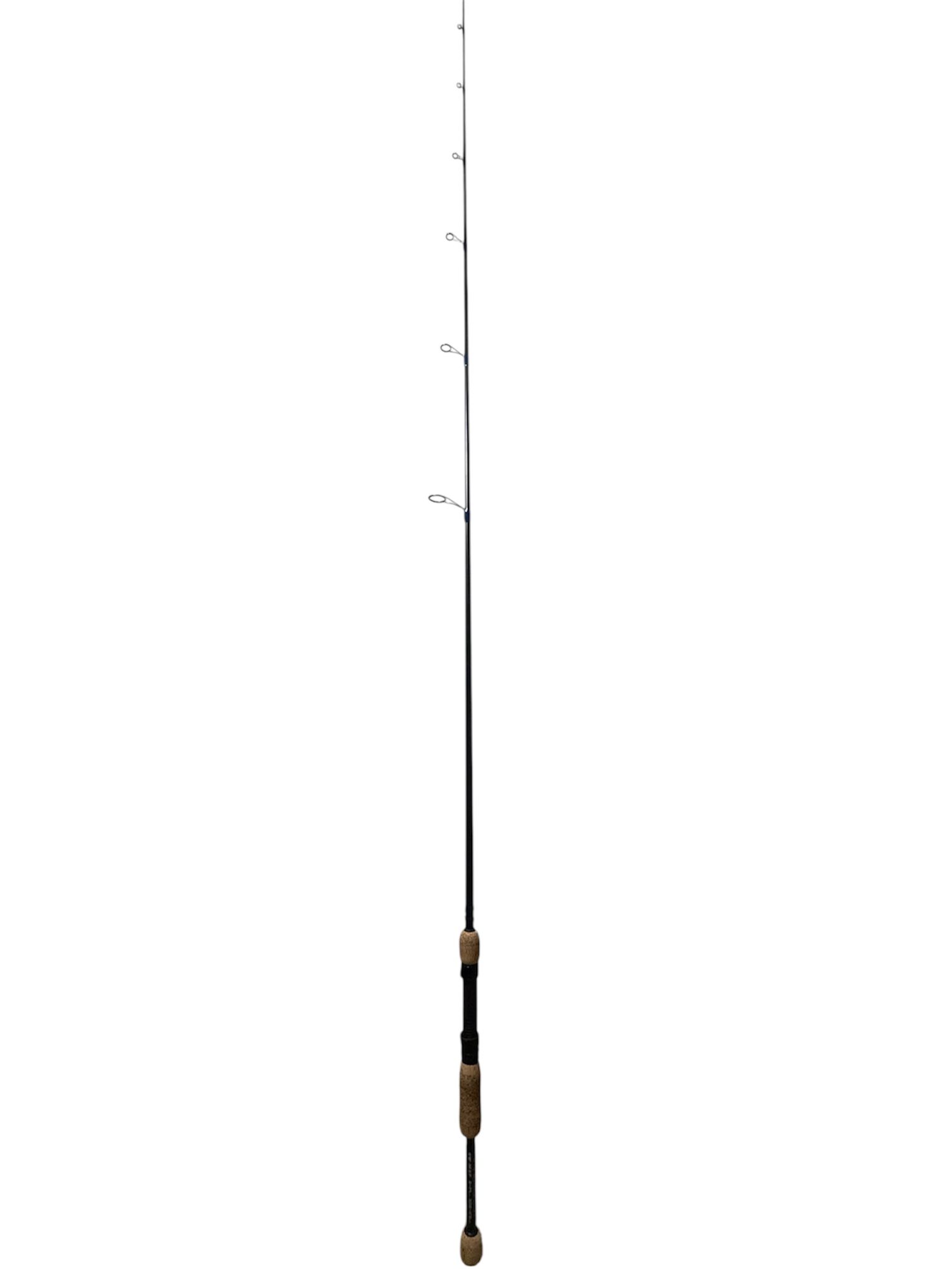 Built for precision and responsiveness, this 6'8" Medium Extra Fast Bass spinning rod is designed for anglers who rely on feel and control when fishing finesse presentations. The extra-fast action tip delivers excellent sensitivity and quick hooksets, while the medium power provides the strength needed to handle larger bass. This build features a black finish, dark blue thread wraps, and a custom split-grip cork handle, giving the rod a clean look that stands out on the water. Rated for 3/16–1/2 oz lures and 6–14 lb. line, this rod is ideal for modern finesse techniques including Ned rigs, Neko rigs, Spybaits, and Hair Jigs. It also performs exceptionally well when paired with forward-facing sonar, allowing anglers to make accurate casts and maintain precise bait control. Constructed with a graphite blend blank, this rod is stronger, lighter, and smaller in diameter, improving sensitivity and reducing fatigue during long days on the water. Like every rod from C&J Custom Rods, this rod is handcrafted with close attention to detail, ensuring durability, performance, and a custom feel on the water.